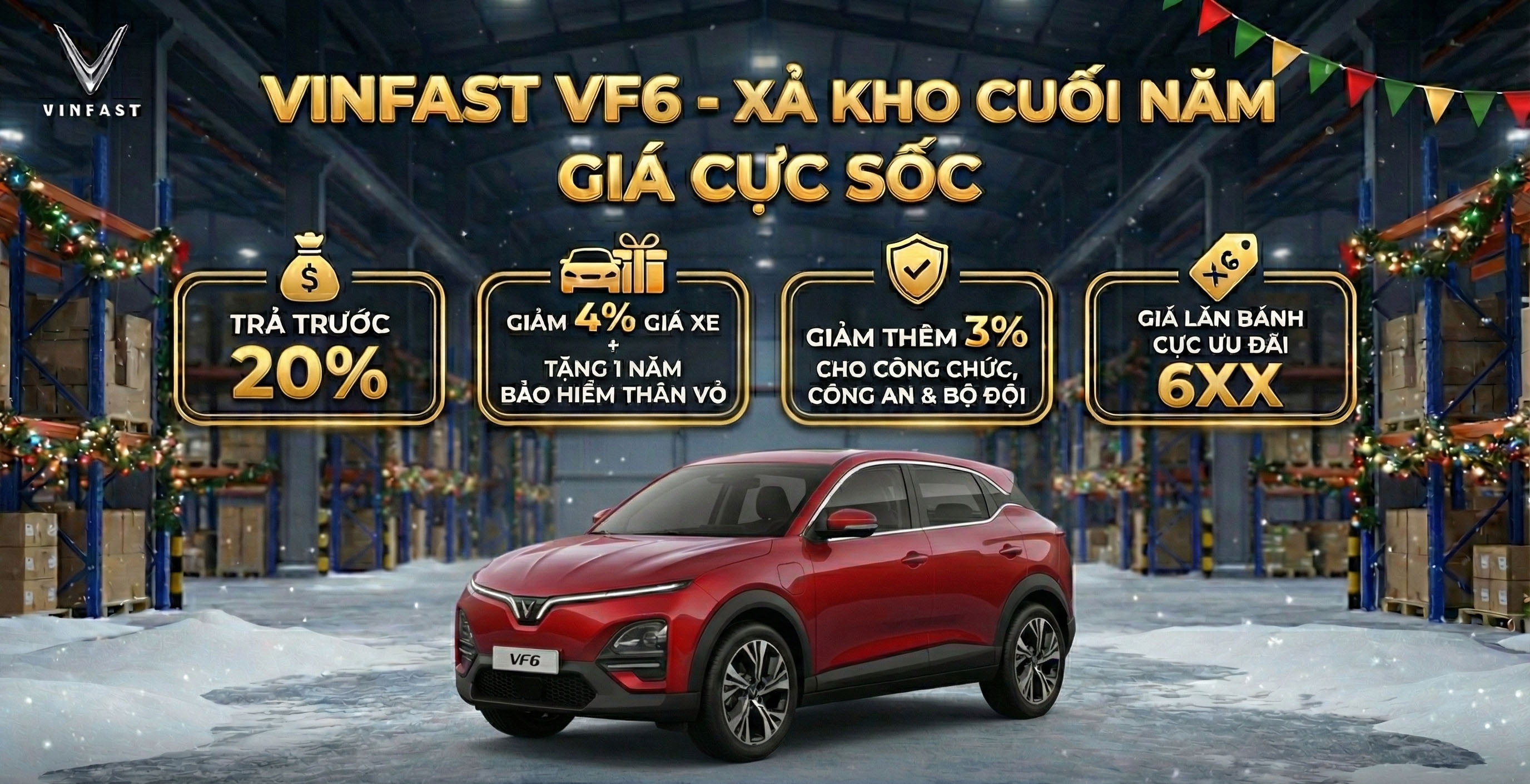 - VINFAST VF6 (Mua Pin): Giá niêm yết chỉ từ 646 triệu - Ưu đãi ngay trước bạ 0 đồng, Ưu đãi 30.000.000 Quy đổi thành điểm VinClup (Áp dụng cho khách ra biển số TP. HCM) 👉 HT Giảm Lãi Suất 3% Trong 3 Năm, Tặng 2 Năm Bảo Hiểm Thân Vỏ Giảm tiền mặt hấp dẫn - Sạc pin miễn phí tại các trạm sạc tới hết 30/06/2027 - Hỗ trợ trả góp lên tới 80% giá trị xe, lãi suất ưu đãi - Liên hệ trực tiếp để có GIÁ ƯU ĐÃI TỐT NHẤT