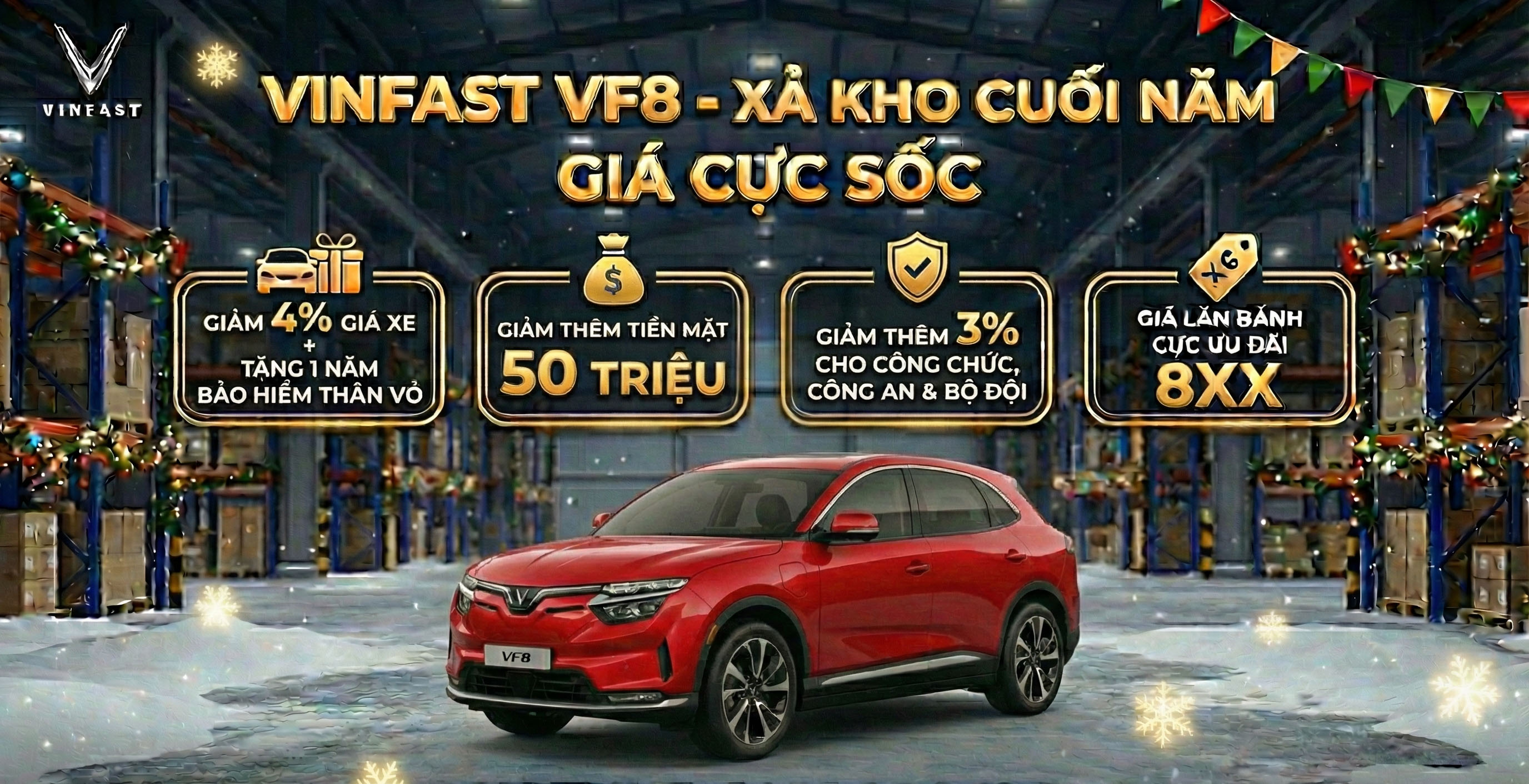 - VINFAST VF8 (Mua Pin): Giá niêm yết chỉ từ 955 triệu - Ưu đãi ngay trước bạ 0 đồng, Ưu đãi 73.000.000 VNĐ Quy đổi thành điểm VinClup (Áp dụng cho khách ra biển số TP. HCM) 👉 HT Giảm Lãi Suất 3% Trong 3 Năm Giảm tiền mặt hấp dẫn - - Sạc pin miễn phí tại các trạm sạc tới hết 30/06/2027 - Hỗ trợ trả góp lên tới 80% giá trị xe, lãi suất ưu đãi - Liên hệ trực tiếp để có GIÁ ƯU ĐÃI TỐT NHẤT